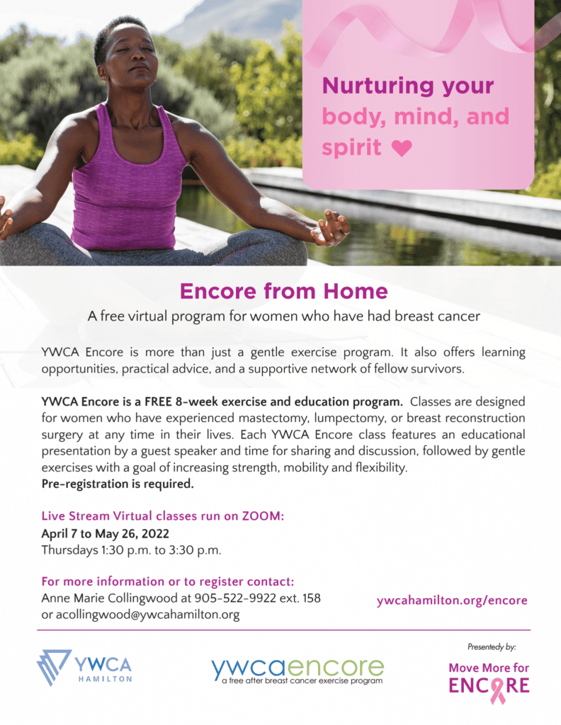 This YWCA program is a free, 8-week exercise and educational program running April 7 to May 26 on Zoom. The classes are designed for those who have had mastectomy, lumpectomy or breast reconstruction surgery at any time in their lives.