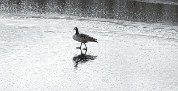 To my surprise, I found a solitary Canada goose, not swimming, but walking alone on the ice. It seemed to me that it wanted to accomplish something in solitude using a different route from the common ones. It is an odd behaviour in comparison to the behaviour of the rest of the waterfowls present that day.