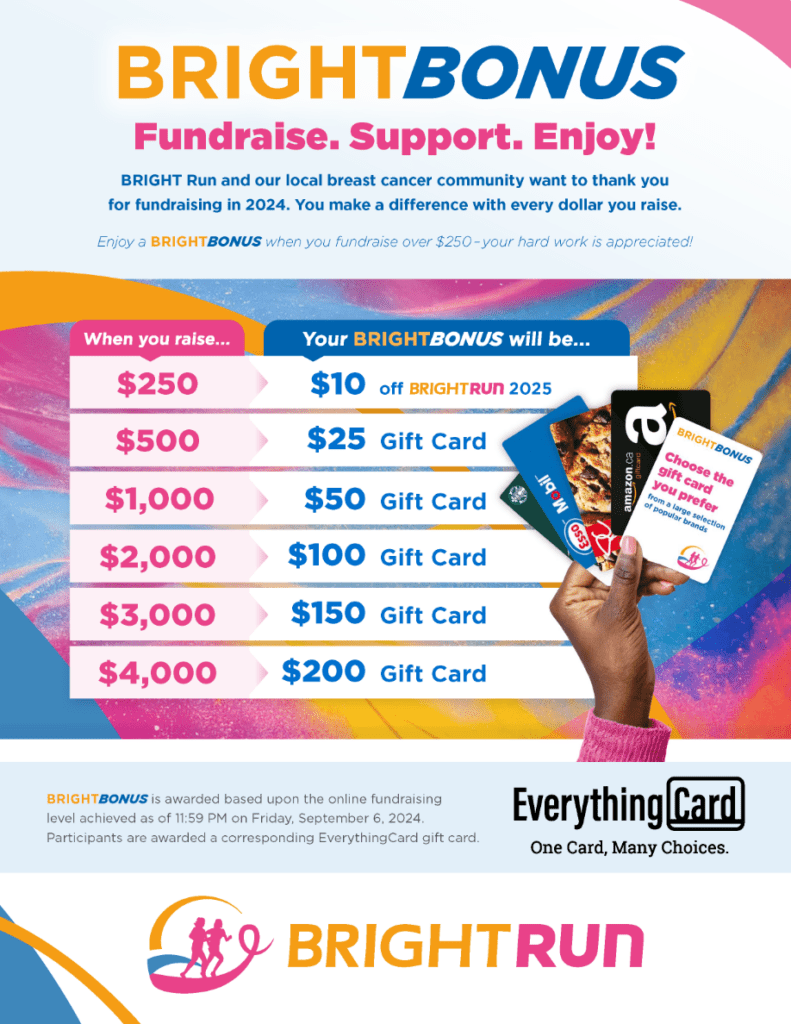 We know raising money is hard work and we believe it’s important to recognize the fundraising achievements of our participants. That’s why the BRIGHT bonus exists. As your fundraising total grows, so does our token of appreciation.