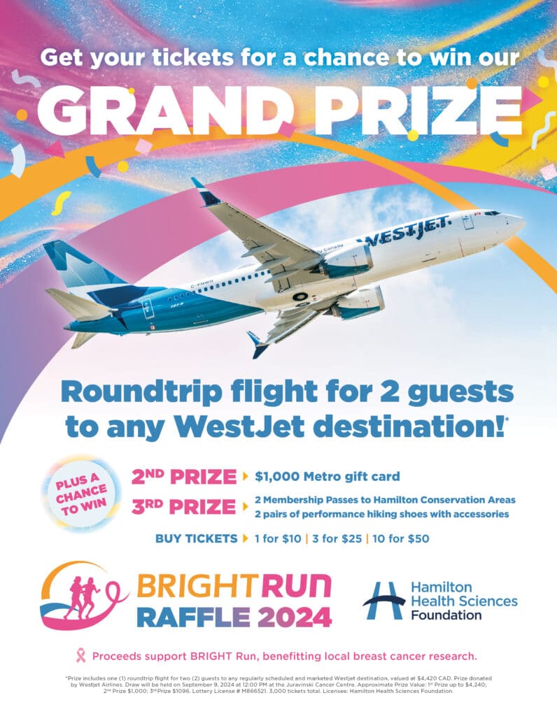 Ticket prices are: 1 for $10, 3 for $25, and 10 for $50. Tickets are available for purchase in the Juravinski Cancer Centre lobby Tuesdays and Wednesdays between now and September 3, as well as at the Cactus and Peach festivals in August and, of course, event day, September 7, at the Christie Lake Conservation Area.