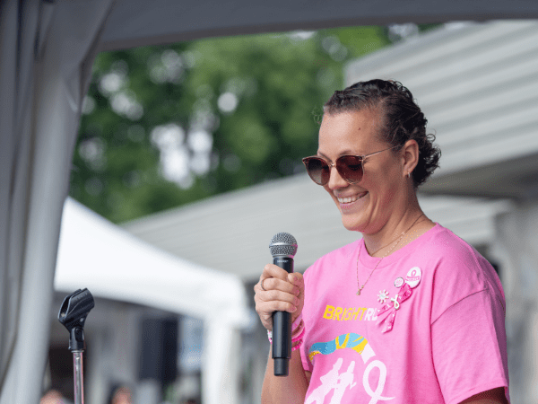 It’s hard to pinpoint one favourite thing or a highlight of the day. I was pulled in a few directions this year (on stage, on camera, MOM duties) so there were a few different notable moments that elicited emotions! The atmosphere arriving on site was so exciting – the music, the people, the PINK! Seeing old friends, new friends, and family come out to support their people was amazing. Witnessing all of the teams and participants gathering for the speeches had me a little awestruck. Seeing everyone out on the trails rallying together was great – it was our first year being able to walk as an entire family.